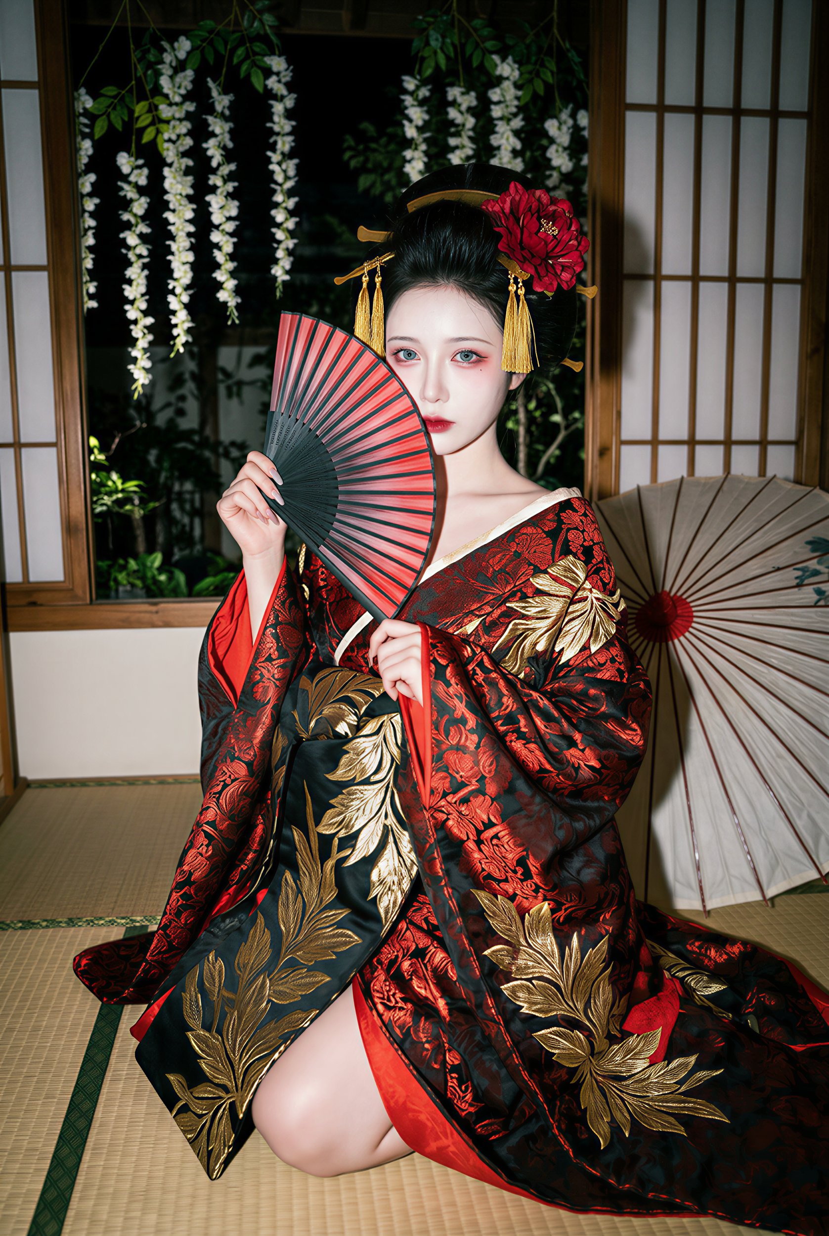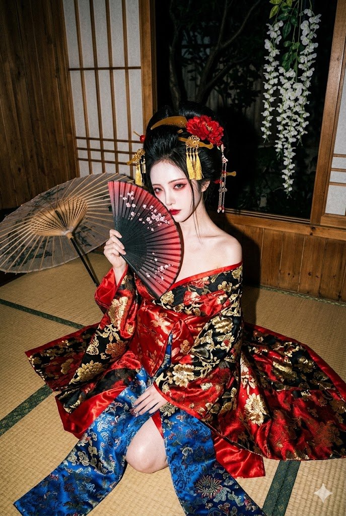 * Slight blown-out edges and reflective hotspots (especially strong reflections on the kimono’s satin surface)