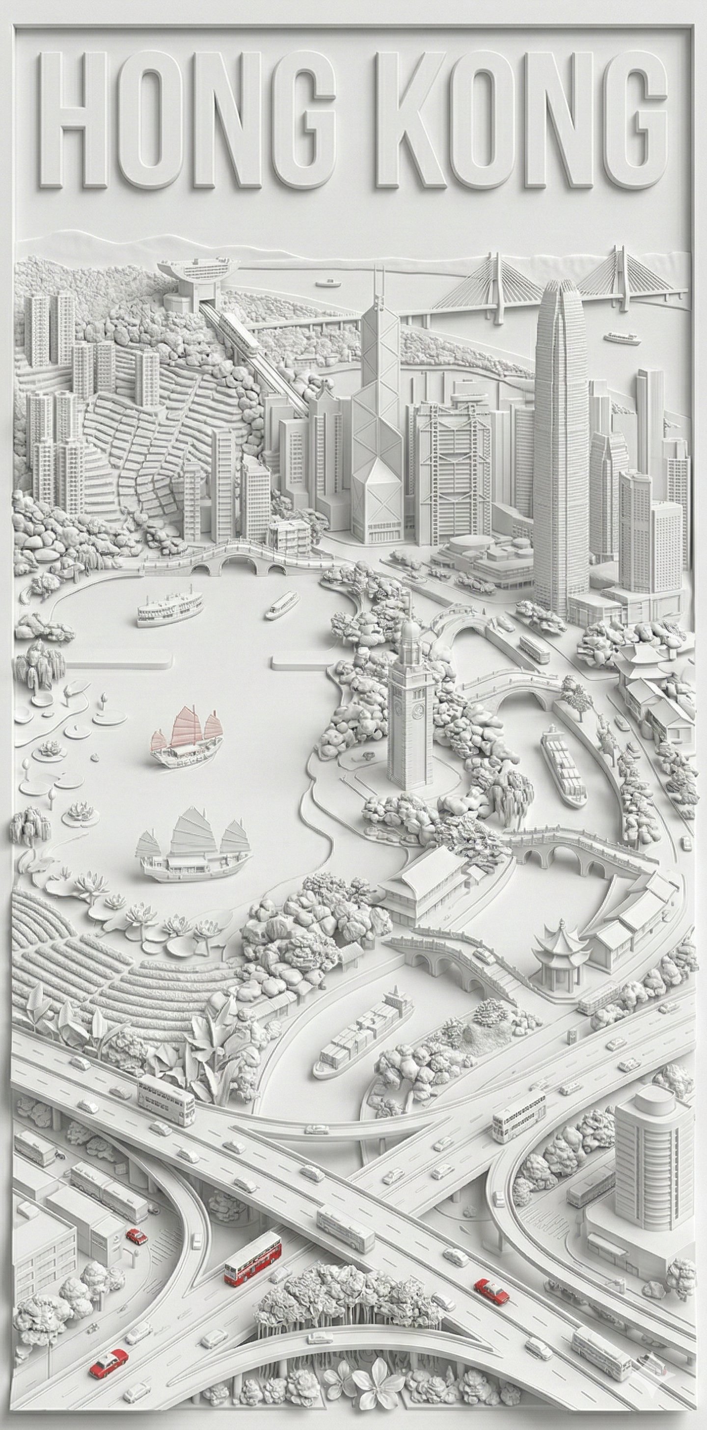 A highly detailed 3D bas-relief poster design representing [CITY_NAME]. A dense collage composition featuring the most iconic landmarks and skyline of [CITY_NAME]. Foreground filled with local transportation systems, busy highway networks with miniature cars, and native vegetation. At the top, features prominent, large, embossed English text in capital letters spelling out the name of the location. Pure white monochromatic clay render, embossed paper texture, soft studio lighting, high visual density, clean commercial illustration style. --ar 1:2