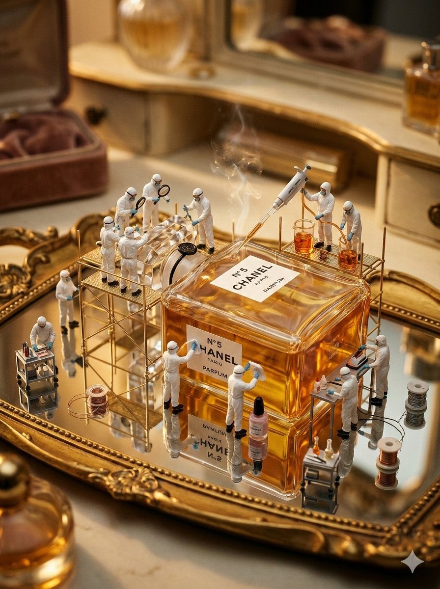 "combined_prompt": "A wide-angle, cinematic tilt-shift macro view featuring a classic horizontal red Coca-Cola can and an elegant Chanel No. 5 perfume bottle placed together on a golden mirrored tray resting on a vintage diner table. Dozens of miniature workers, some in denim work gear and others in white protective suits, swarm both objects. Intricate scaffolding towers line the surfaces of both items like a rocket assembly, complete with tiny ladders and supply carts. The workers are busy polishing the Coke logo, scraping off rust, and wiping condensation droplets, while others simultaneously inspect the crystal perfume cap, pipette golden aromatic fluid, and polish the Chanel label as tiny scent-mist vapors rise into the air. The scene is beautifully illuminated by a blend of warm retro diner lighting and soft elegant gold tones reflecting off the metal, glass, and condensation, highlighting a hyper-realistic mix of high-end glamour and miniature industrial detail --ar 3:4"