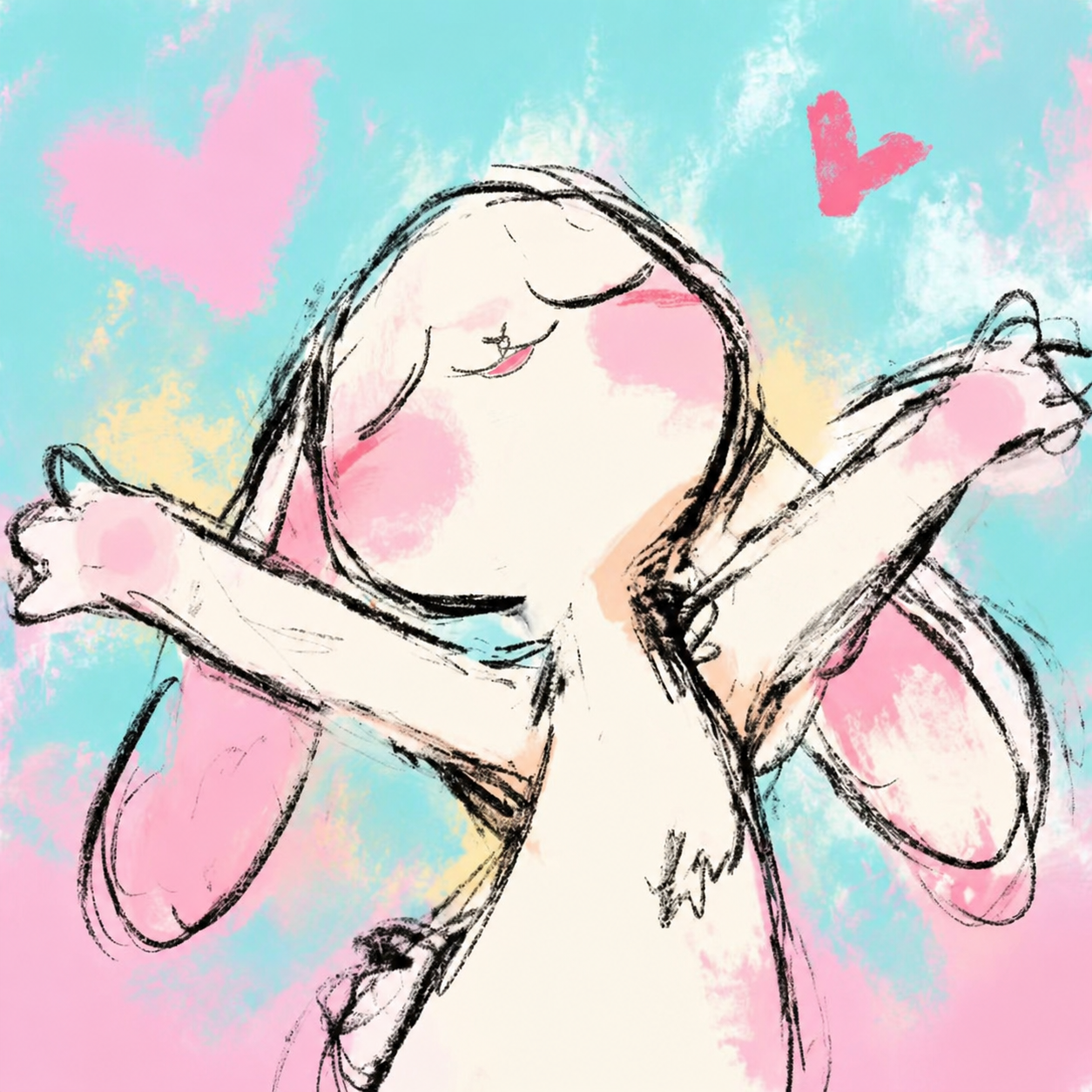 一幅2D手绘涂鸦风格的插画,主体是一只拟人化小白兔。兔子呈半身特写构图,双臂大张作拥抱状,头部微仰。面部表情放松,闭眼微笑着,脸颊带有夸张的粉色水彩晕染腮红,两只长耳向后下垂。