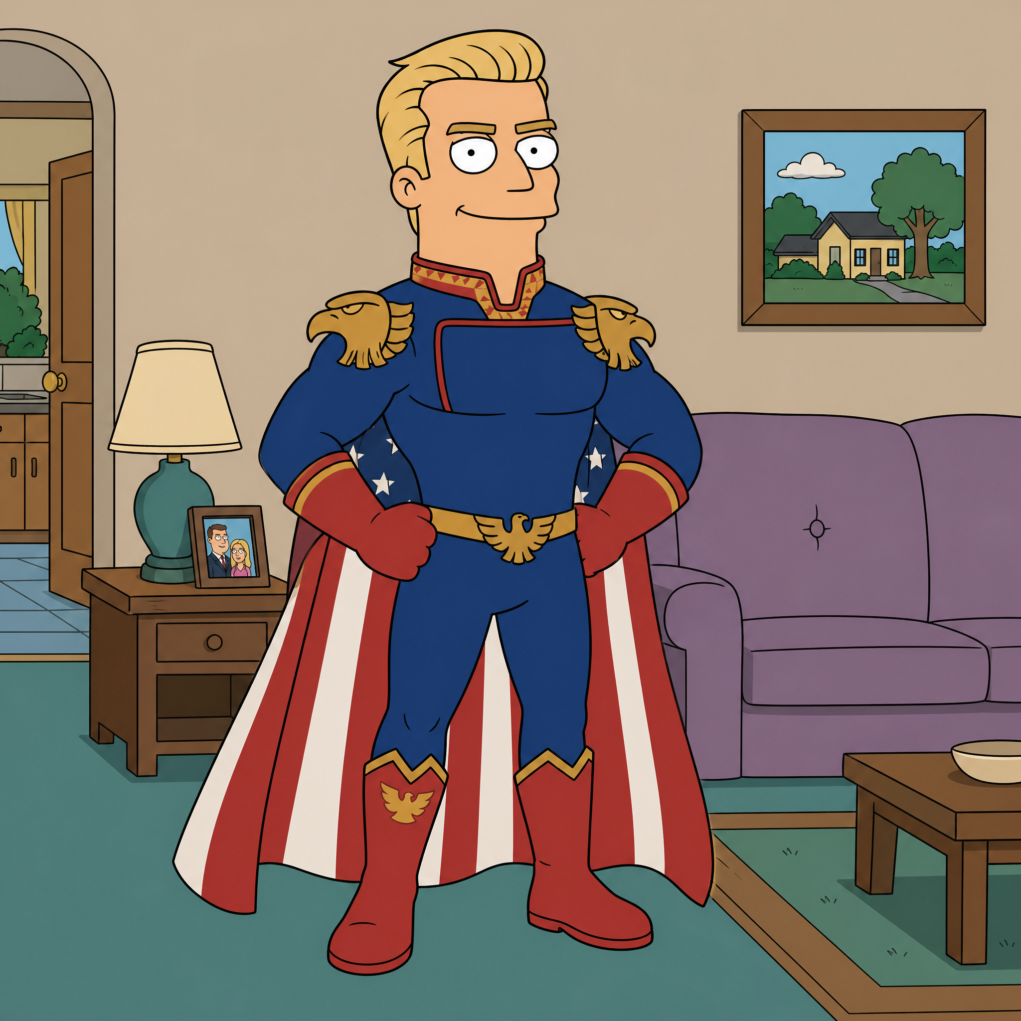 Redraw Homelander as a character from an American adult animated sitcom (similar to Family Guy, The Simpsons, or Rick and Morty).