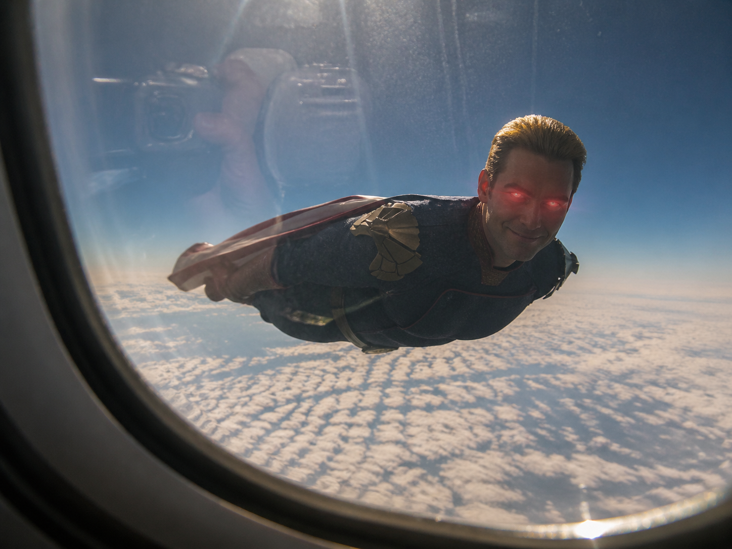 POV视角,从客机舷窗向外望去,黑袍纠察队的祖国人正在远处与飞机并肩飞行,与镜头直接对视,面带微笑但压迫感十足,眼睛散发红光。画面由手机拍摄,带有轻微抖动、曝光不均和真实的玻璃反光,增强临场感与纪录片氛围。远处是广阔的云海与蓝天,光线强烈而真实。