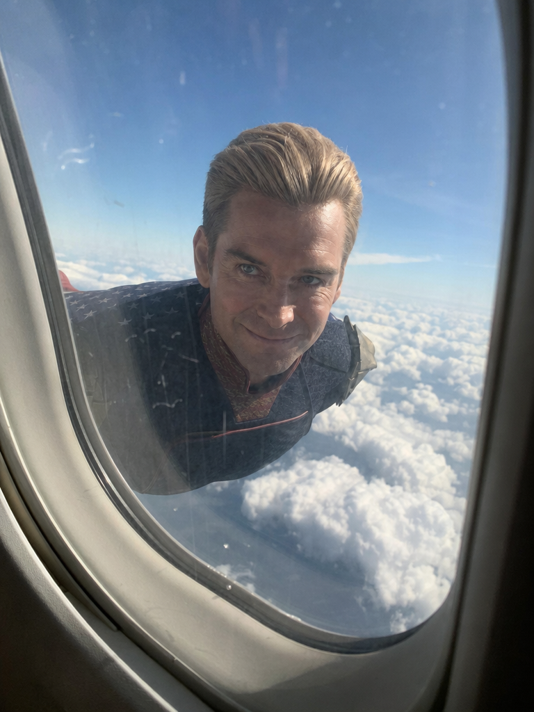 POV视角,从客机舷窗向外望去,黑袍纠察队的祖国人正与飞机并肩飞行,与镜头直接对视,面带微笑但压迫感十足。画面由手机拍摄,带有轻微抖动、曝光不均和真实的玻璃反...
