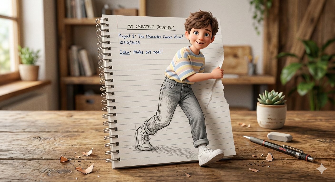 "prompt": "A creative 3D illusion artwork of a cute young boy stepping out of a spiral notebook page placed on a wooden desk. The notebook has lined paper with handwritten text at the top. The boy appears in a semi-realistic 3D cartoon style, with soft messy brown hair, natural fresh face, and a cheerful smile. He is wearing a pastel oversized t-shirt, high-waisted light grey jeans, and clean white sneakers. His lower body is sketched in pencil on the notebook page, while his upper body looks fully realistic and popping out of the paper, creating a striking 3D illusion effect. Warm soft lighting, detailed wooden desk texture, shallow depth of field, ultra-detailed, high resolution.",